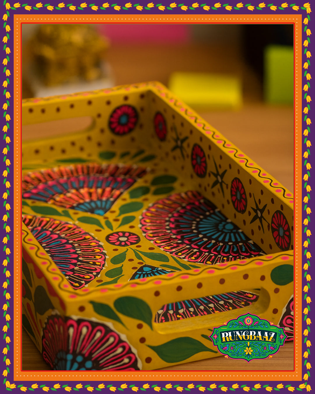 Featuring bold floral bursts on a vivid yellow base, this tray is the perfect fusion of color and culture. It’s ideal for serving drinks, holding trinkets, or simply as an artful addition to your space.
